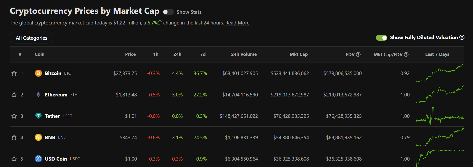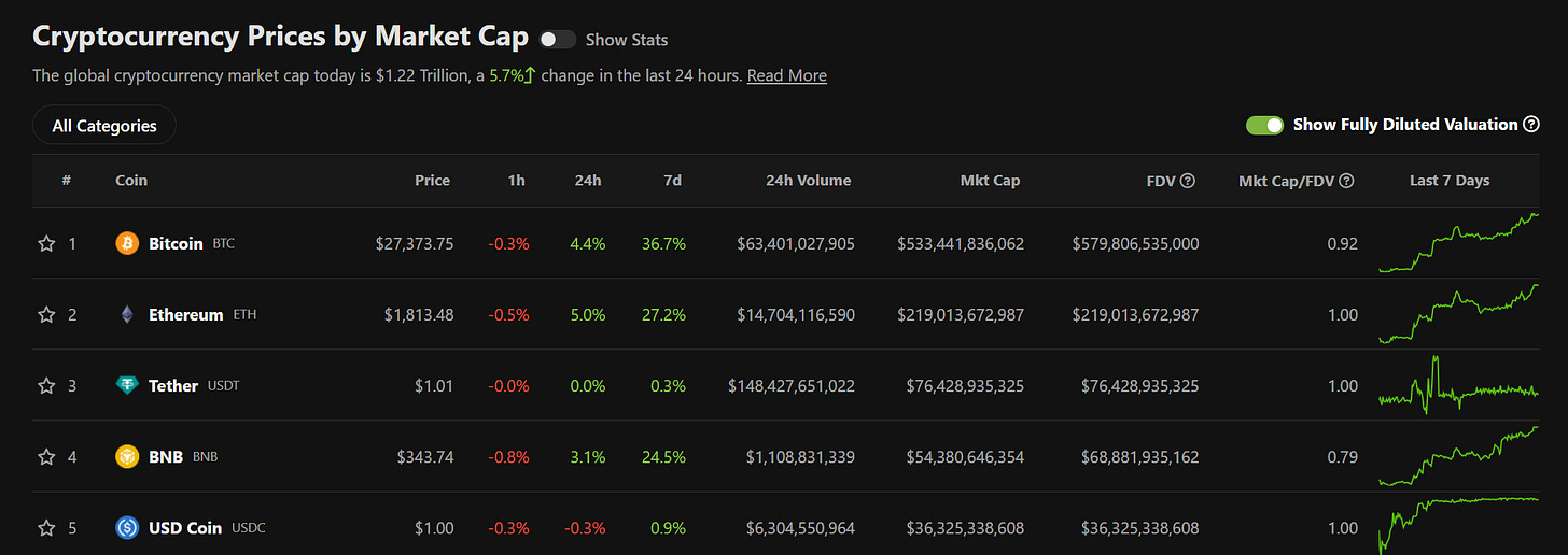 Impressive move by especially BTC after a turbulent week (well covered in this week additional newsletters) and ECB hiking. Lower interest rate expectations and governement interventions to save banks, spurred a broad based crypto rally. BTC 66% year-to-date (YTD) growth is vastly outperforming top Wall Street bank stocks, particularly as fears of a global banking crisis are rising. Speaking of which: